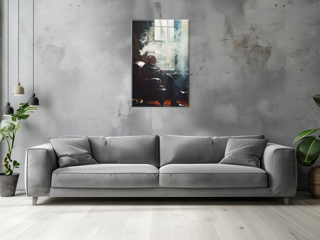 Na obraze je zobrazený Winston Churchill, ktorý pohodlne sedí v luxusnom kresle a fajčí cigaru. V miestnosti je jemné svetlo, ktoré prichádza cez veľké okno, vytvárajúc pokojnú atmosféru. Dym z cigary sa vznáša v miestnosti, čo pridáva scéne nostalgický a relaxačný pocit.