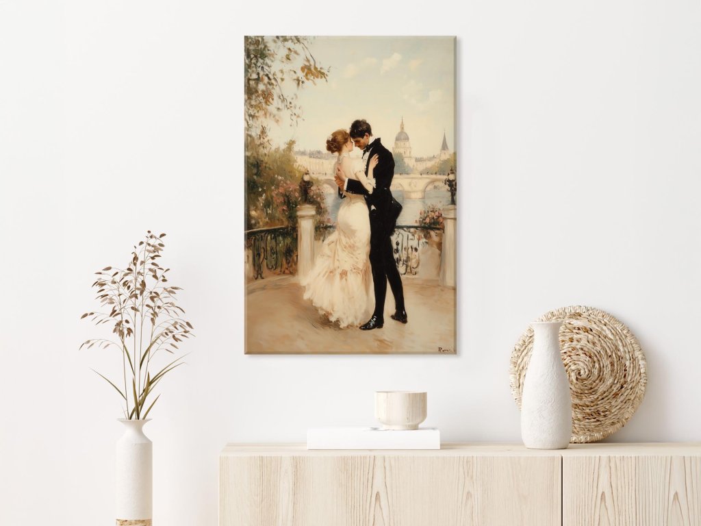 Obraz zobrazuje romantický moment, keď elegantný pár v historickom oblečení tancuje v nežnom objatí na kvetmi zdobenej terase. V pozadí sa rozprestiera panoráma Paríža s mostom cez Seinu a ikonickými kupolami. Jemné farby, svetlo a ladné pohyby navodzujú atmosféru lásky, nostalgie a nadčasovej elegancie.