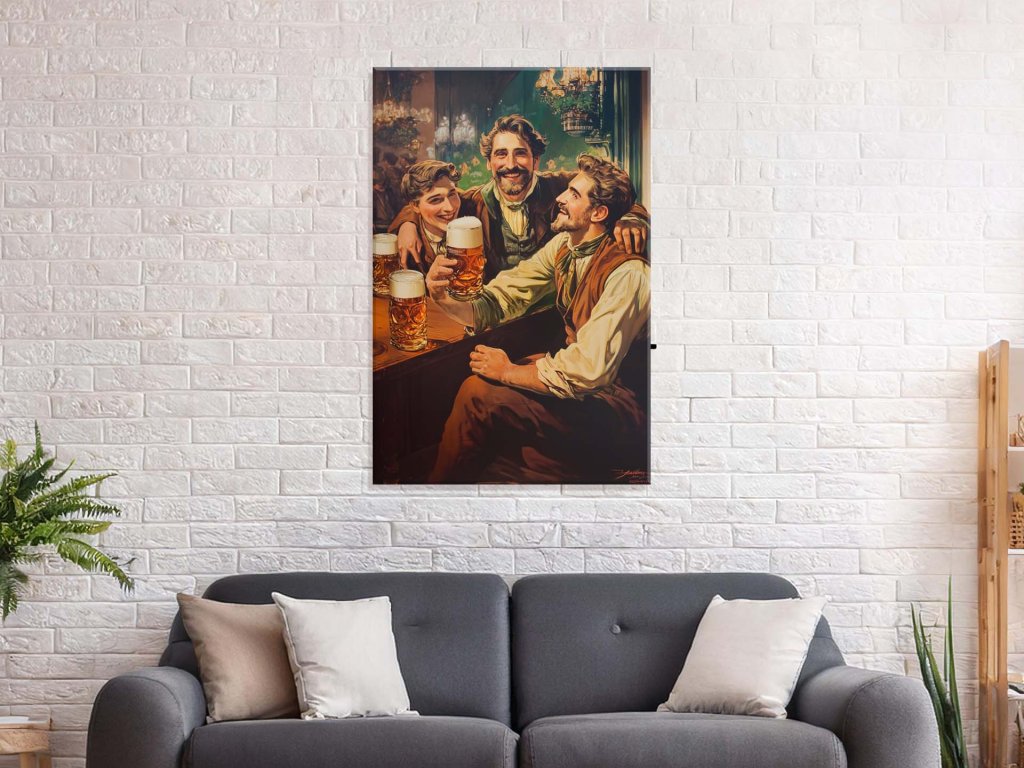 Obraz zobrazuje troch mužov v tradičnom prostredí, ktorí sa veselo smejú a zdieľajú spoločný prípitok s veľkými pohármi piva. Atmosféra je teplá, priateľská a uvoľnená, zvýraznená útulným osvetlením v pozadí. Táto scéna evokuje radosť zo spoločných chvíľ a pripomína dôležitosť priateľstva a osláv.