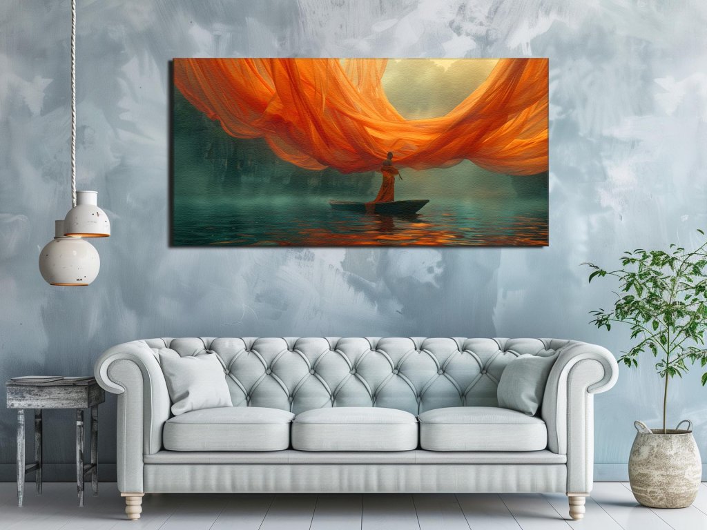 Osamotená postava v tradičnej róbe stojí na malom člne, obklopená masívnymi oranžovými látkami vznášajúcimi sa vo vzduchu a odzrkadľujúcimi sa na hladine vody. Tajomná hmlovina a vzdialené strmé útesy dodávajú scéne pocit zázračného pokoja. Tento obraz vytvára dojem tichého zamyslenia a spojenia s prírodou vo výnimočnom a poetickom prostredí.