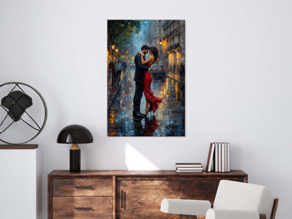 Uprostred rušného večerného mesta stojí muž a žena, stratení v momente lásky, keď spolu tancujú v daždi. Jej červené šaty sa jemne vlnia vo vetre, zatiaľ čo mestské svetlá a odrazy na mokrej dlažbe vytvárajú magickú atmosféru. Obraz vyžaruje vášeň, romantiku a krásu nečakaných chvíľ, ktoré vznikajú v srdci každodennosti.