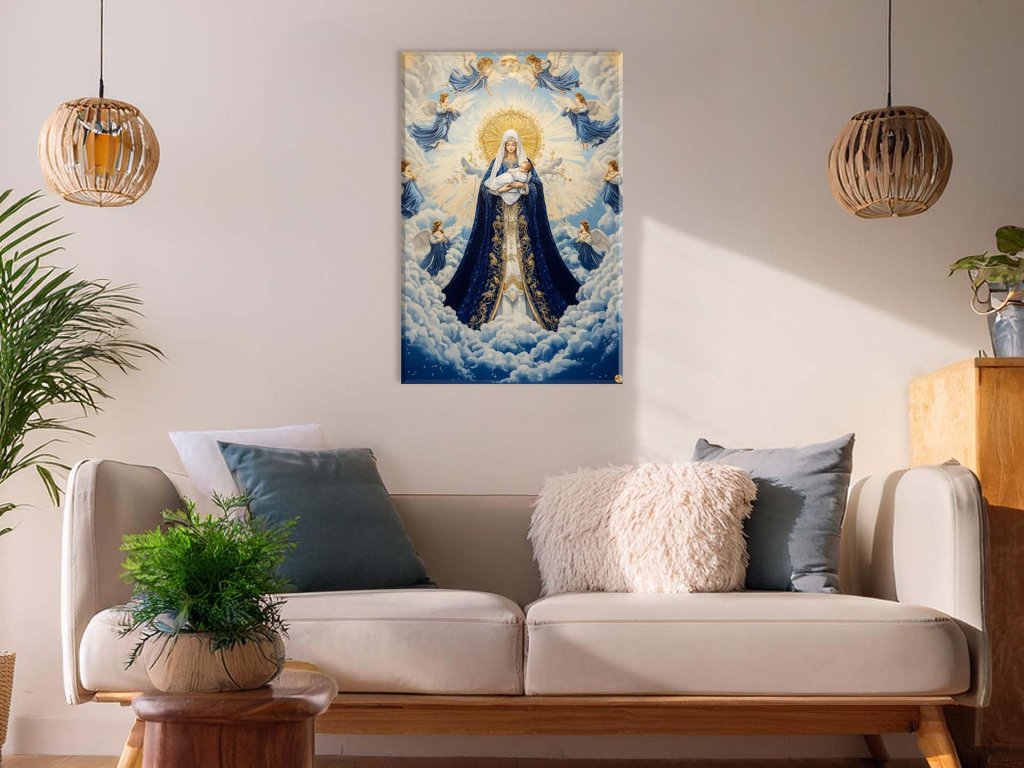 Tento obraz zobrazuje Pannu Máriu, ktorá s láskou drží malého Ježiša v náručí, pričom jej hlava je obklopená svätožiarou a zlatým svetlom, ktorý symbolizuje Božiu prítomnosť. Okolo nej sa nachádzajú anjeli oblečení v modrom, ktorí ju uctievajú a chránia, pričom celý obraz dýcha pokojným a posvätným duchom. Atmosféra je naplnená svetlom, ktoré charakterizuje duchovné posolstvo lásky a ochrany.