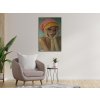 Tento portrét ukazuje mladú ženu so zavretými očami, ktorá má hlavu opretú o ruky, zatiaľ čo nosí veľkú farebnú čiapku. Jej pery sú jemne nalíčené na ružovo a jej výraz je pokojný a zasnenejší. Obraz má teplé farebné tóny a texturálny povrch, ktorý pripomína škrabancovú maľbu.