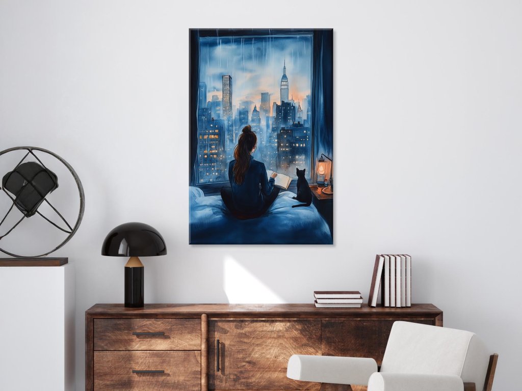 Tento obraz zachytáva pokojnú chvíľu dievčaťa sediaceho na posteli s knihou, zatiaľ čo sleduje dažďom zahalené mesto z veľkého okna. Vedľa nej sedí čierna mačka, ktorá rovnako mlčky pozoruje svet vonku. Atmosféra je melancholická, no zároveň útulná, so svetlom lampy vytvárajúcim teplý kontrast k chladným modrým tónom daždivého večera.