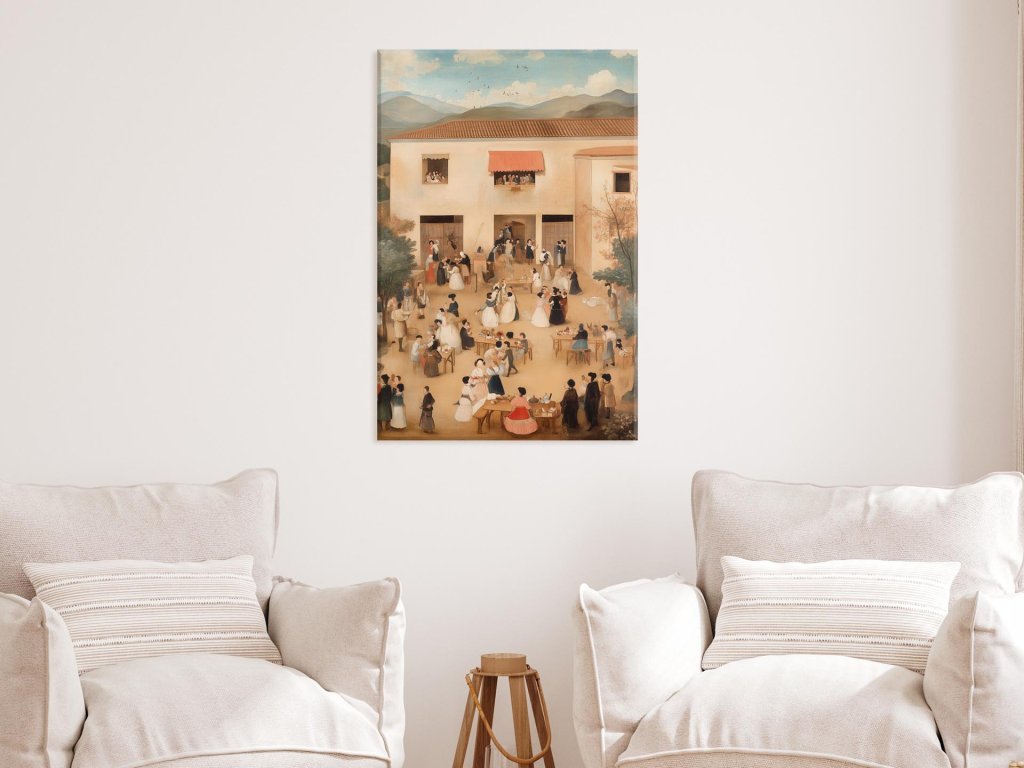 Obraz znázorňuje dedinský dvor plný ľudí, ktorí sa zúčastňujú slávnosti s tancom, hudbou a jedlom. Postavy v tradičnom odeve sa pohybujú medzi stolmi, deti sa hrajú a z okien sledujú dianie ďalší obyvatelia domu. Atmosféra obrazu je plná pokoja, spolupatričnosti a radosti zo spoločného stretávania.