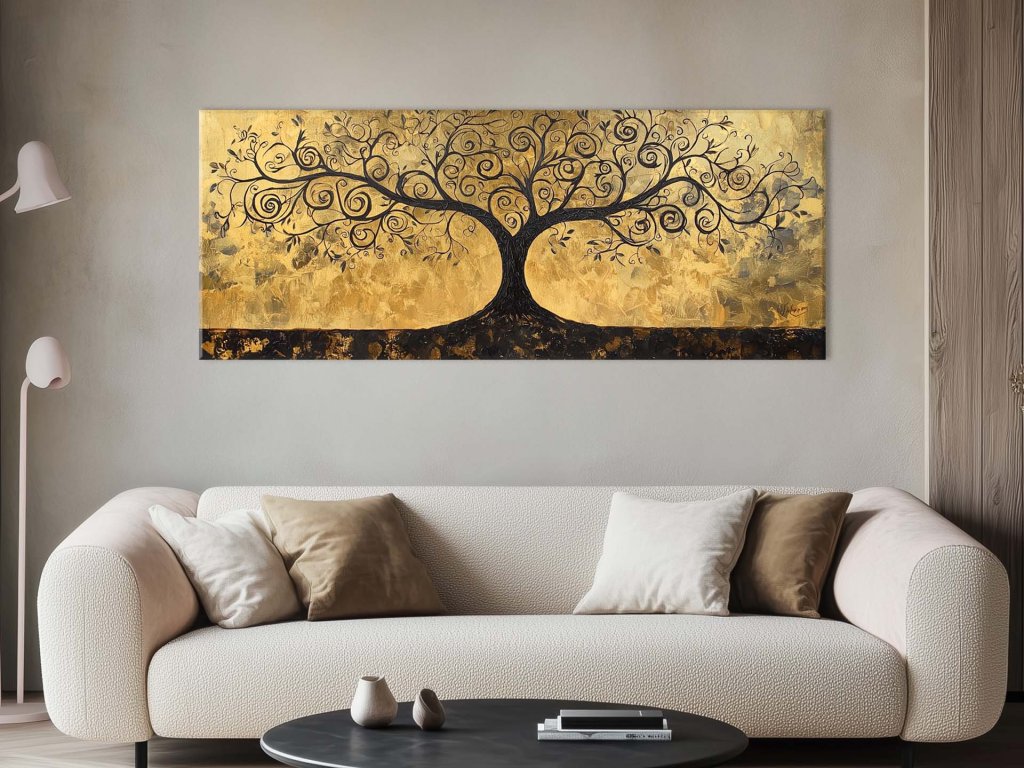 Tento obraz zobrazuje strom s vetvami, ktorý sa krúti do krásnych špirál, čo symbolizuje poškodenú. Zlaté pozadie zvýrazňuje majestátnosť stromu a jeho nadpozemskú energiu. Tento výjav prináša pokoj a pocit harmónie, ktorý odráža prepojenie prírody a človeka v nekonečnom kolobehu života.