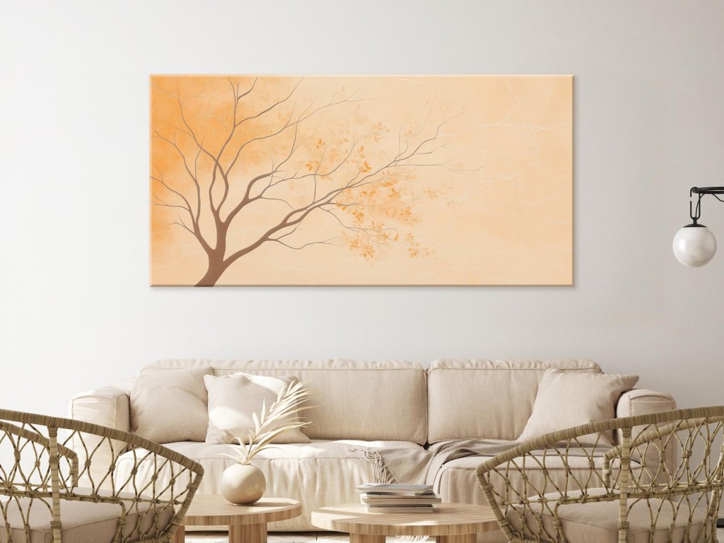 Obraz pôsobí ako pokojná jesenná meditácia – vetvy sa plynulo rozvíjajú zľava doprava a nesú so sebou ľahké lístie v odtieňoch oranžovej a broskyňovej. Pozadie v teplej béžovej farbe s jemnou textúrou vytvára tiché, takmer zenové prostredie. Minimalistická kompozícia a jemnosť línií vyvolávajú pocit harmónie, rovnováhy a spomalenia.