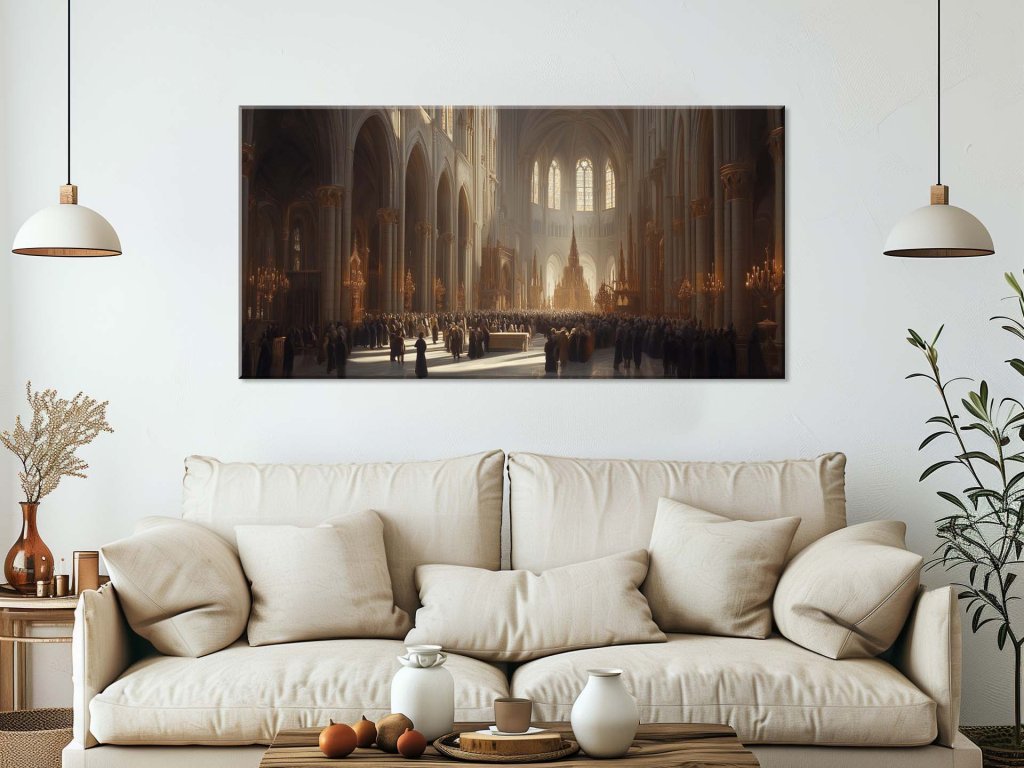 Tento obraz zachytáva impozantnú scénu v rozľahlej gotickej katedrále, kde sa koná náboženský obrad. Vysoké klenuté stropy a veľké vitrážové okná osvetľujú zlatistými lúčmi dav veriacich zhromaždených v priestore. Atmosféra je pokojným svedectvom o duchovnej vznešenosti a tradícii, ktorú prinášajú takéto sakrálne miesta.