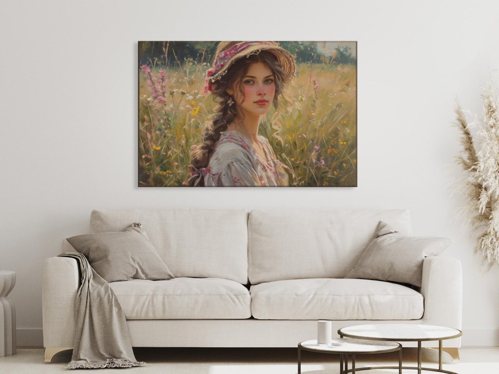Portrét mladej ženy s nádhernými črtami tváre, odetej v tradičnom oblečení a klobúku, zahĺbenej do letnej krajiny s kvetmi. Jej pohľad je zasnený, či zamyslený. Pastelové farby a mäkké svetlo dodávajú obrazu romantickú a pokojnú atmosféru.