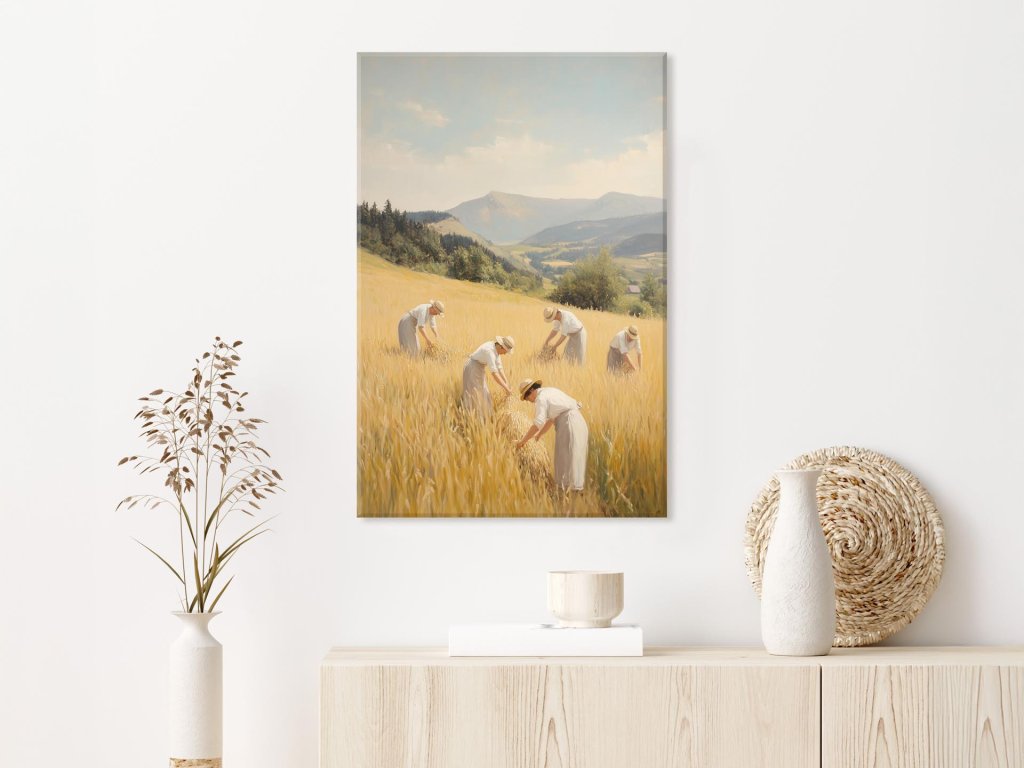 Na obraze vidíme skupinu ľudí v bielych košeliach a slamených klobúkoch, ktorí usilovne viažu klasy na rozľahlom poli pod modrou oblohou. Scéna je zarámovaná majestátnymi horskými štítmi a zalesnenými kopcami, ktoré vytvárajú pokojné a harmonické pozadie. Atmosféra obrazu vyžaruje rytmus tradičného vidieckeho života a úctu k práci rúk v súlade s prírodou.