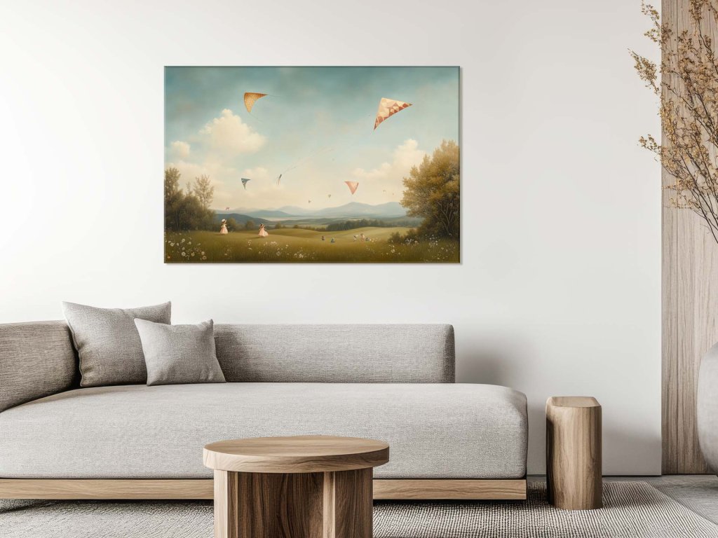 Obraz zachytáva pokojný letný deň na zelenej lúke, kde sa skupina detí s radosťou venuje púšťaniu šarkanov. Na oblohe sa vznášajú rôznofarebné šarkany, zatiaľ čo v diaľke sa črtajú siluety hôr pod jemnými oblakmi. Atmosféra obrazu vyžaruje nostalgiu, hravosť a pokojný návrat do bezstarostného detstva.