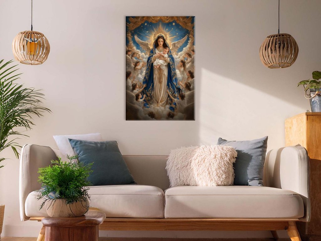 Obraz zobrazuje Pannu Máriu, ako s láskou drží malé dieťa, Ježiša, obklopenú zástupom jemných anjelov, ktorí ju uctievajú. Panna Mária má na seba kráľovský modrý plášť zdobený zlatými vzormi, čo zdôrazňuje jej nebeský charakter a úctu, ktorú si zaslúži. Celá scéna je plná svetla, ktorá vyžaruje zhora, čo symbolizuje božskú prítomnosť a ochranu.