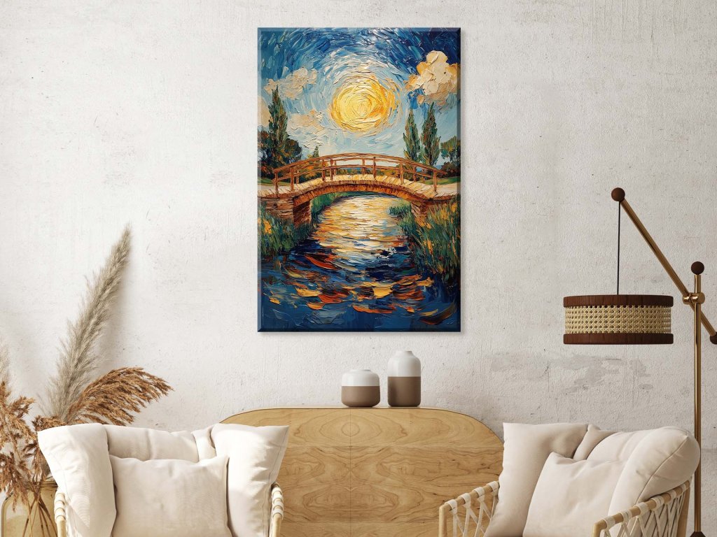 Tento obraz zachytáva drevený most, ktorý sa klenie nad pokojnou riekou odrážajúcou žiarivé farby zapadajúceho slnka. Slnko je dominantným prvkom, ktorý rozjasňuje oblohu aj vodnú hladinu a pridáva obrazu dynamiku a teplo. Stromy okolo rieky spolu so živými farbami vytvárajú harmonický a pokojný vidiecky výjav.