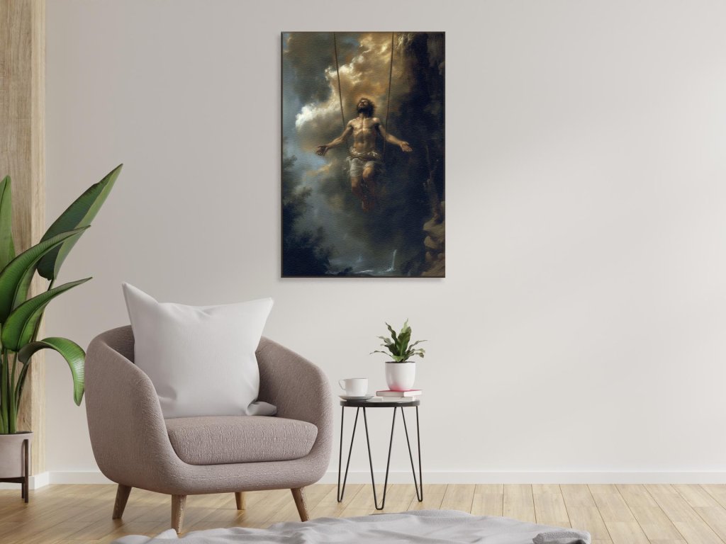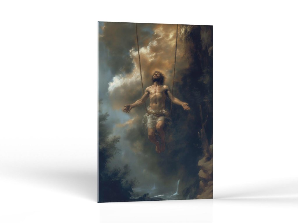 Tento obraz zachytáva muža, ktorý je zdvihnutý do vzduchu na lanách, s hlavou obrátenou k nebu v akte vytrvalosti alebo obetovania. Súhra svetla a tieňa na obraze vytvára zmysel pre hlbokú emotívnosť a spirituálnu atmosféru. Zadné pozadie obrazu s temnými a svetlými oblačnými formáciami dodáva scéne pocit mýtického alebo transcendentálneho významu.