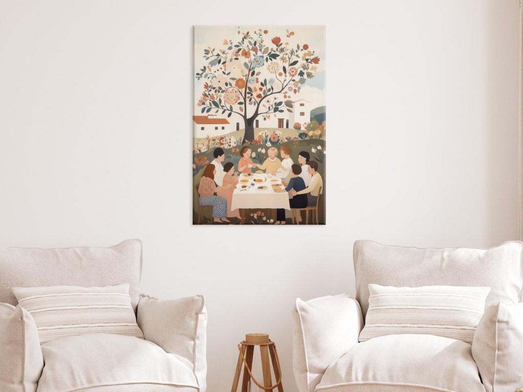 Obraz zobrazuje teplú a láskavú chvíľu, kde sa viacgeneračná rodina stretáva pri bohato prestretom stole uprostred kvetinovej záhrady. Scéna pôsobí ako spomienka na detstvo, pokoj a rodinnú súdržnosť, umocnená pastelovými farbami a jemnými tvarmi. Dominantný strom nad nimi symbolizuje rast, život a prepojenie medzi generáciami.