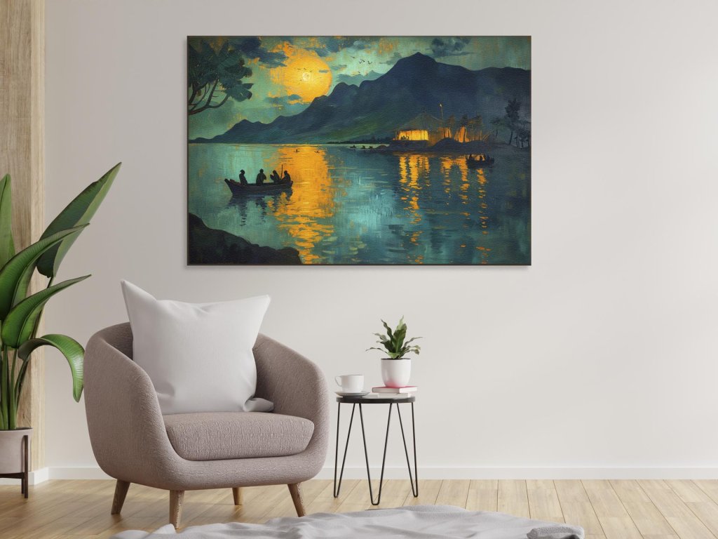 Obraz zobrazuje scénu pri jazere s ľuďmi na člnkoch, ktorí sa plavia na pozadí osvetlených domčekov a horizontu za súmraku. Mäkké odrazy svetla slnka na vodnej hladine dodávajú kompozícii pokojný, tajomný nádych. Tmavo modré tóny oblohy a hôr v pozadí v kontraste so zlatými a oranžovými odleskami vytvárajú dojem teplej tropickej noci.