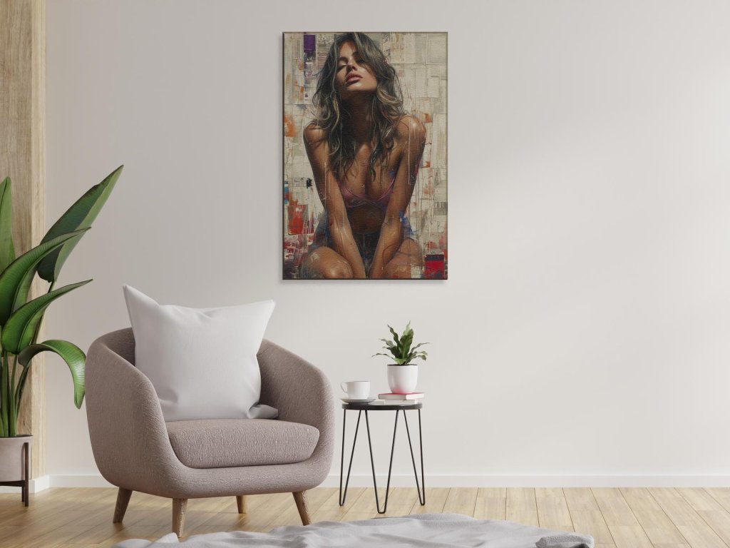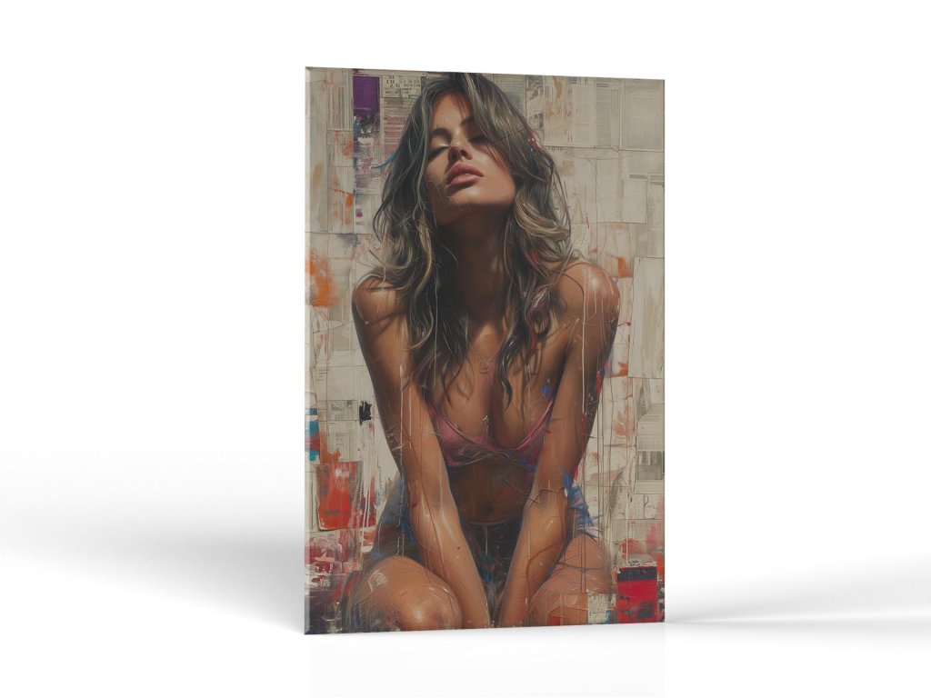 Obraz predstavuje mladú ženu s mierne zaklonenou hlavou a zatvorenými očami, ktorá sedí na pozadí s textovými a abstraktnými elementmi. Jej vlasy sú voľne rozpustené a na sebe má ružový spodný diel plaviek. Výraz jej tváre naznačuje zamyslenie alebo snenie.