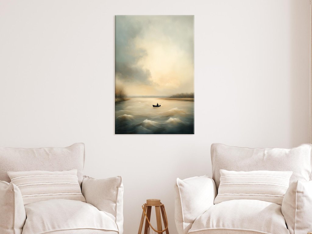 Obraz zobrazuje muža sediaceho v malej loďke, ako v tichu rána rybárči na mierne rozbúrenej hladine rieky. Obloha je zahalená ťažkými mrakmi, no napriek tomu cez ňu presvitá jemné svetlo nového dňa. Scéna pôsobí melancholicky a zároveň pokojne, akoby stelesňovala vnútorné rozjímanie a spojenie človeka s prírodou.