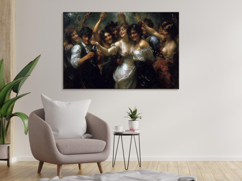 Obraz zobrazuje radostnú skupinu mladých ľudí, ktorí sa bavia a zdvíhajú poháre na oslavu. Muži a ženy sú oblečení v dobových kostýmoch, čo naznačuje, že scéna sa môže odohrávať v minulosti. Farby a svetlo na obraze pridávajú živelnosť a dynamiku zobrazenému momentu.