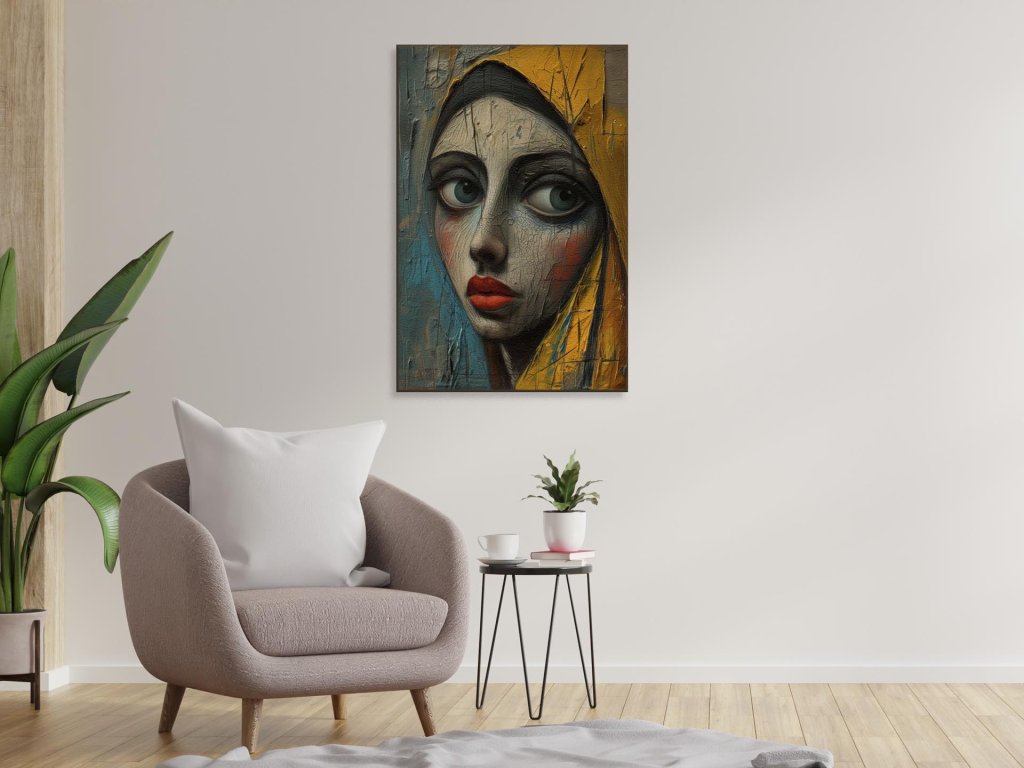 Na obraze je zobrazená žena s intenzívnym a hlbokým pohľadom, ktorý je umocnený kontrastnými farbami a textúrami pozadia. Tvár má jemné, ale výrazné rysy, a je oblečená v žltej šatke, ktorá dopĺňa farbu na rozpraskanom pozadí obrazu. Umelcova práca s farbou a textúrou dodáva portrétu dynamiku a expresivitu.