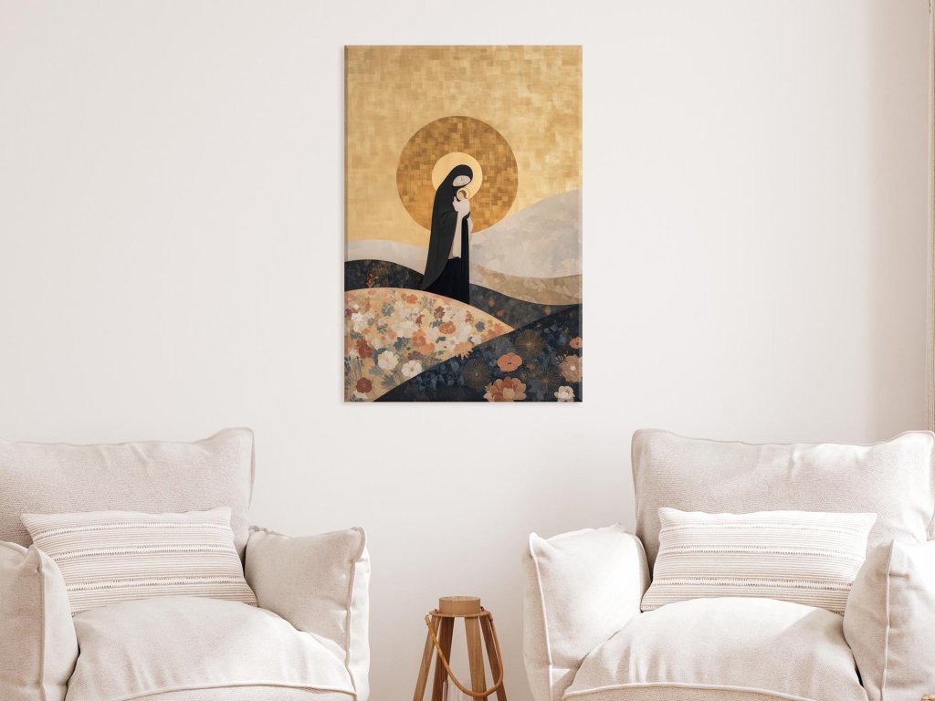 Ikonická postava matky držiacej dieťa, obklopená zlatým svetlom a kvetinovým pokojom.