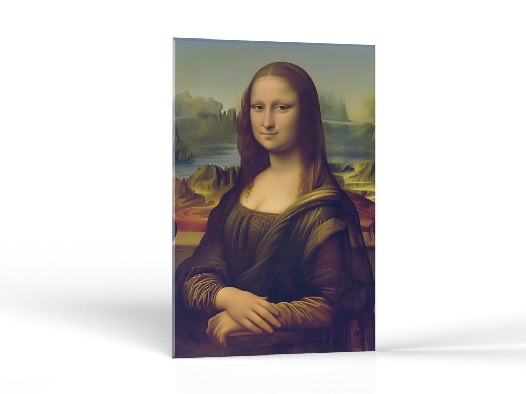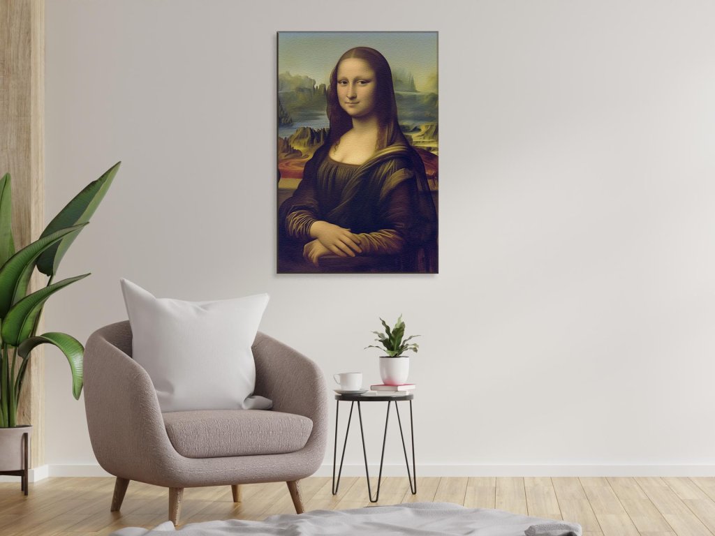 Tento obraz je modernou interpretáciou slávneho diela, kde žena s charakteristickým tajomným úsmevom sedí pred rozostreným pozadím, ktoré naznačuje vzdialené krajinné prvky. Jej pohľad a mierny úsmev sú zachytené s mimoriadnym detailom, čo vytvára dojem hlbokého vnútorného pokoja a sebaistoty. Oblečenie a účes postavy sú zobrazené v klasickej renesančnej maniére, čo dodáva obrazu historický kontext.