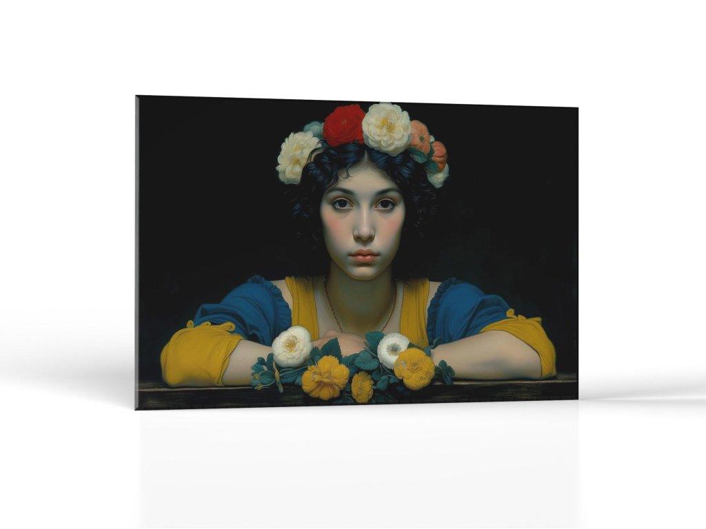 Tento obraz ukazuje mladú ženu s tmavými kučeravými vlasmi a kvetmi vo vlasoch, oblečenú v historickom odeve. Jej pohľad je zameraný priamo na diváka, čím vytvára intímnu atmosféru. Výraz na jej tvári je tichý a zamyslený, čo dodáva portrétu záhadnosť a eleganciu.