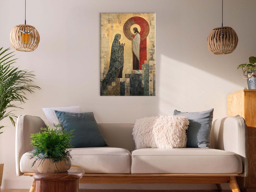 Tento obraz zachytáva dôležitý duchovný moment, kde dve postavy, Panna Mária a Ježiš, stoja oproti sebe v modlitebnej póze. Obe sú obklopené zlatým a červeným svetlom, čo zvýrazňuje ich svätosť a božský pôvod. Jednoduché, no zároveň bohaté detaily obrazu, ako aj veľké ozdoby na šatách, ktoré poskytujú tomuto dielu hlbokú sakrálnu atmosféru.