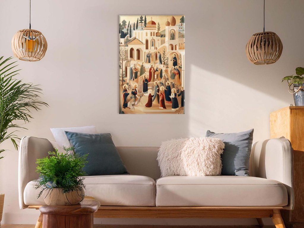 Tento obraz ukazuje skupinu svätcov a biblických postáv, ktorí sú obklopení architektonickými stavbami pripomínajúcimi staroveké chrámy. Každá postava má zlatú svätožiaru, čo symbolizuje ich svätosť a duchovnú čistotu. Scéna pôsobí pokojným a mystickým dojmom, zdôrazňuje duchovnú hĺbku a božskú prítomnosť vo vzájomných stretnutiach.