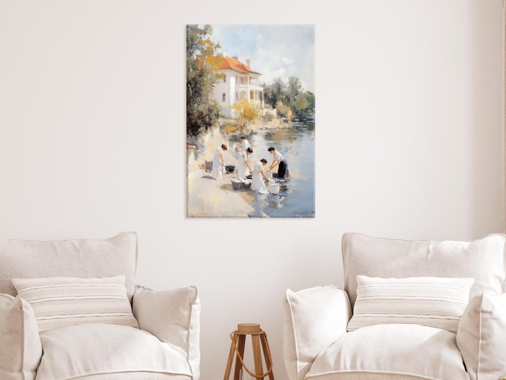 Obraz zachytáva skupinu žien v tradičnom odeve, ktoré pracujú pri brehu pokojnej rieky za slnečného dňa. Ich pohyby sú sústredené, tiché a zladené, akoby boli súčasťou prirodzeného rytmu krajiny. V pozadí sa týči veľký biely dom s červenou strechou, obklopený zeleňou, ktorý dodáva scéne nádych nostalgie a pokojného vidieckeho života.