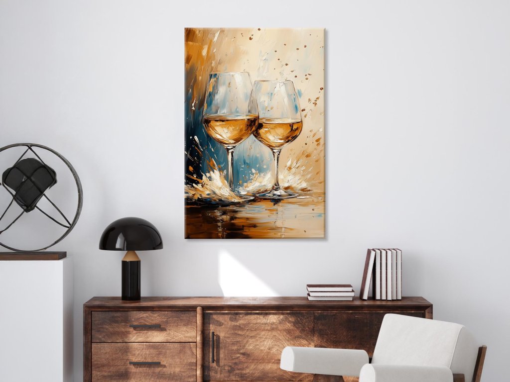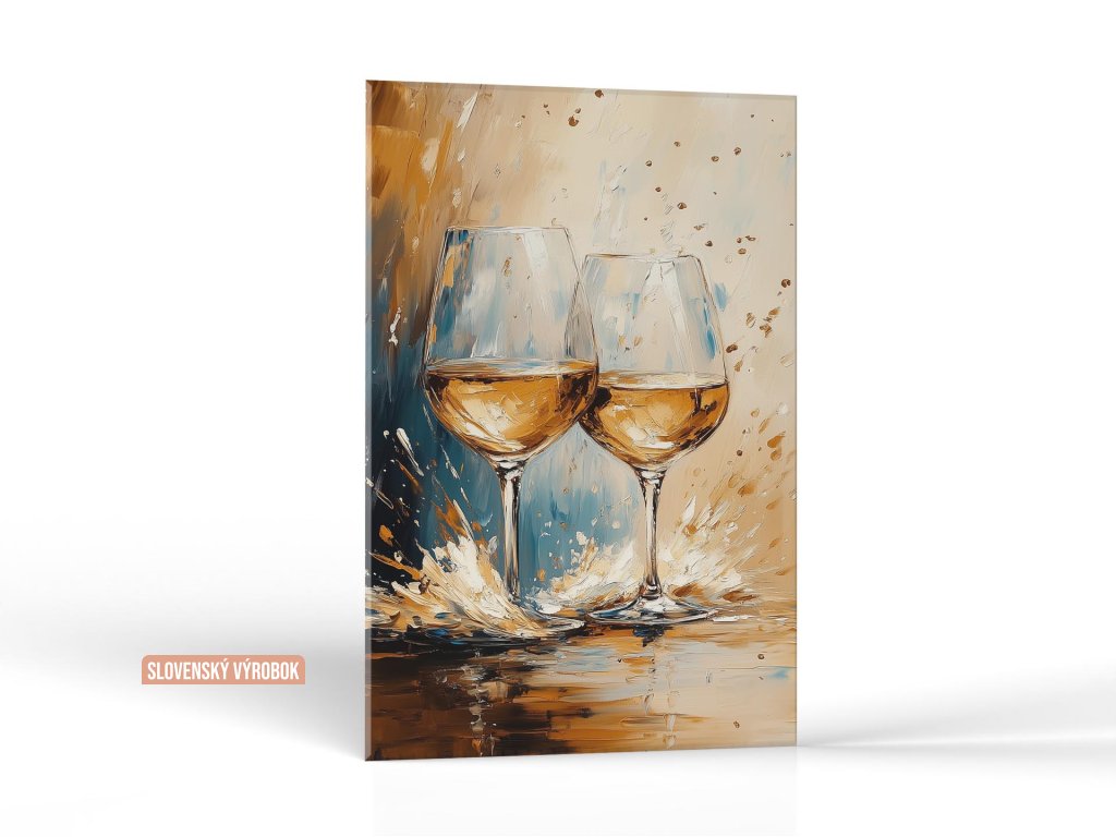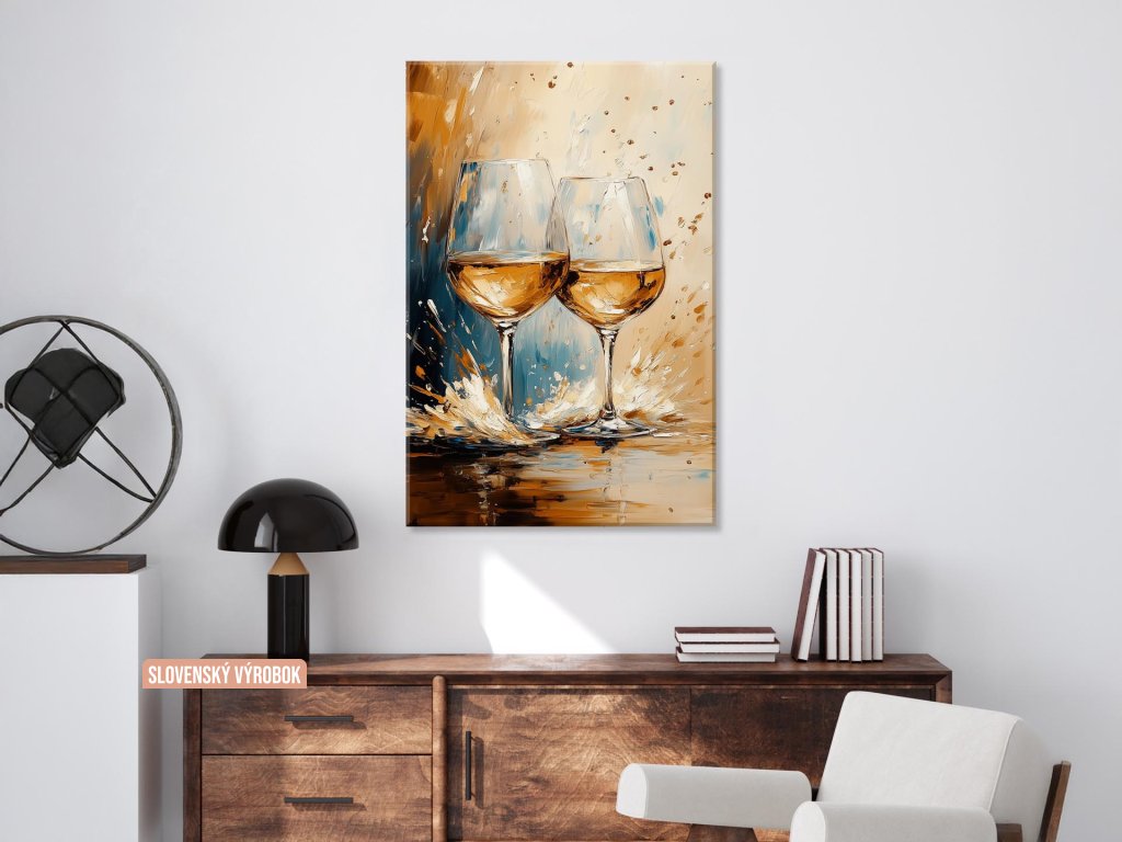 Tento obraz zobrazuje dvojicu vínových pohárov zachytených v okamihu oslavy, kde víno špliecha a farby sa prelínajú v teplých zlatistých a modrých tónoch. Silné a výrazné farby vytvárajú pocit pohybu, energie a radosti. Celá kompozícia pôsobí ako výbuch emócií, ktorý oslavuje chvíle blízkosti a výnimočných okamihov.