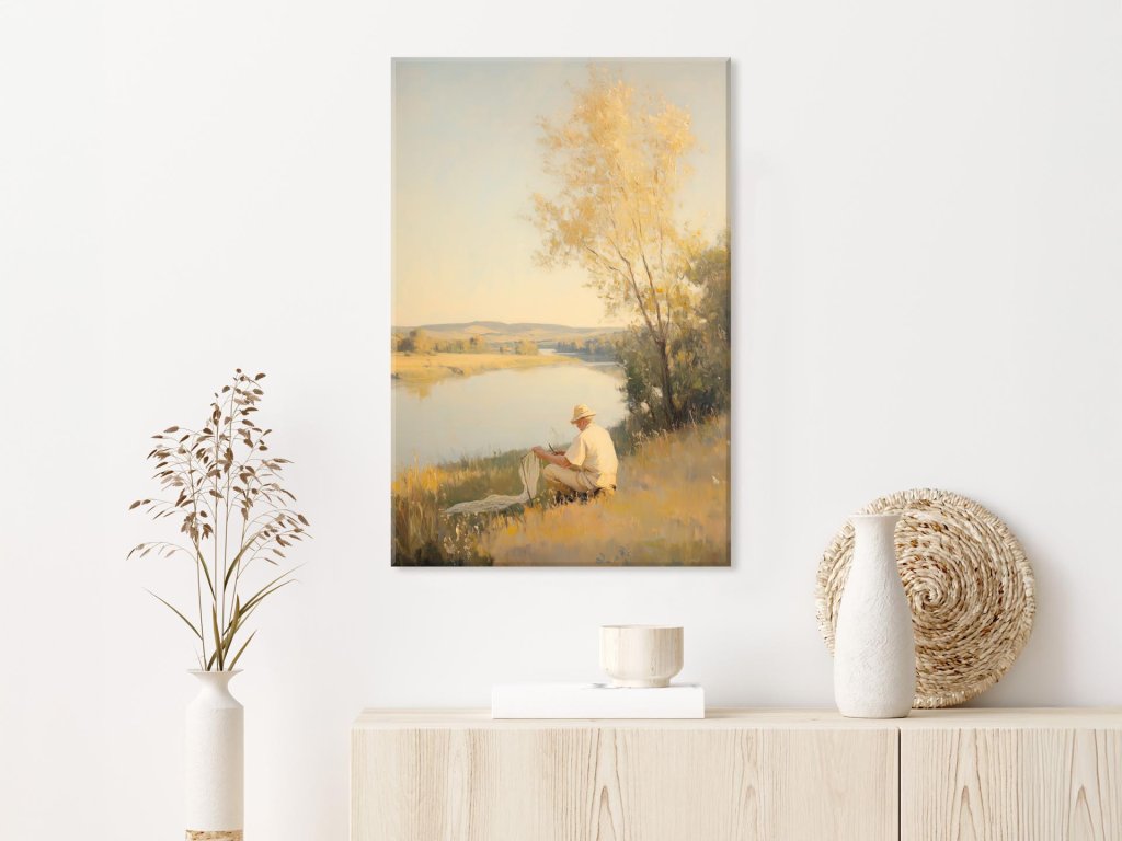 Obraz zachytáva pokojný moment pri rieke, kde starší muž v klobúku sedí v tráve a venuje sa práci s rybárskou sieťou. Slnečné svetlo jemne zalieva krajinu a vytvára hrejivú atmosféru plnú ticha a sústredenia. Scéna pôsobí nostalgicky a harmonicky, ako oslava jednoduchého života v súlade s prírodou.
