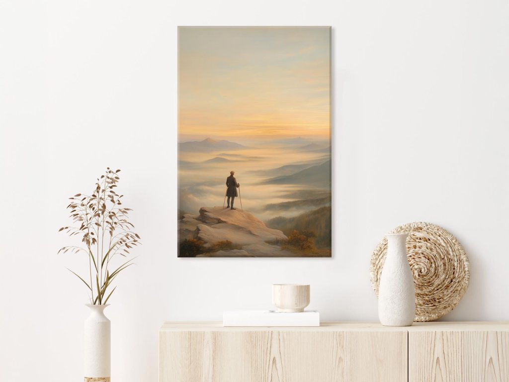 Obraz zachytáva postavu muža opierajúceho sa o palice, ako stojí na vrchole skaly a hľadí do nekonečnej krajiny pokrytej rannou hmlou. Horizont je zalitý zlatistým svetlom vychádzajúceho slnka, ktoré vytvára atmosféru tichej úcty a introspekcie. Scéna symbolizuje nielen fyzickú výšku, ale aj duchovnú cestu, vnútorný pokoj a túžbu po poznaní nekonečna.
