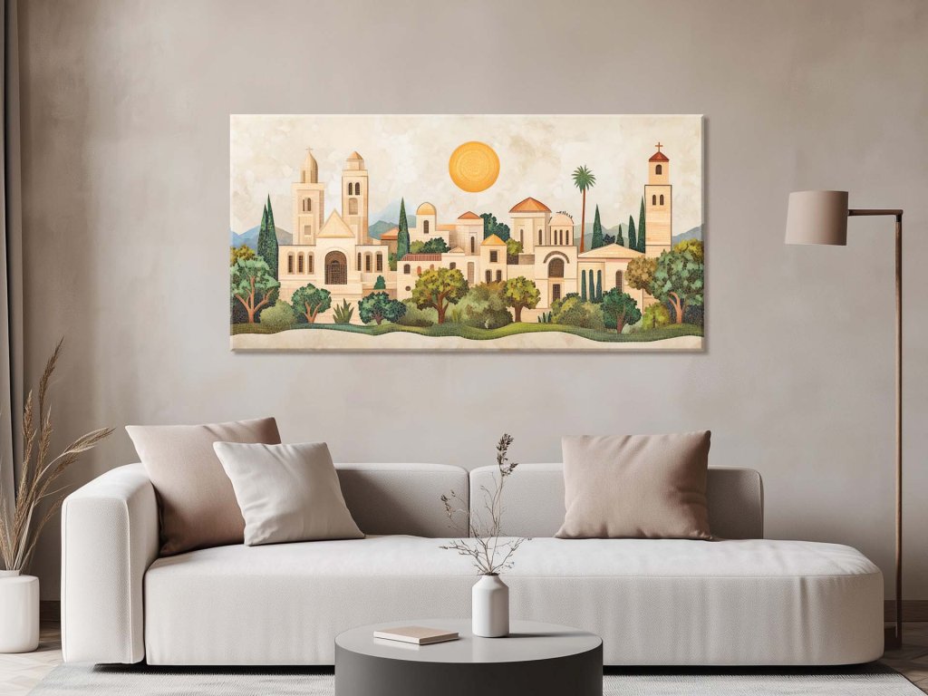 Tento obraz zachytáva historické mesto s dominantnými vežami a katedrálou, ktoré sa týčia pod veľkým oranžovým slnkom. Mestské stavby sú obklopené bujnou zeleňou stromov a rastlín, čo vytvára pocit pokoja a harmónie. Celková kompozícia obrazu pôsobí ako mozaika, ktorá kombinuje geometrické tvary s prírodnými prvkami a symbolizuje pokojný život v malebnom mestečku.
