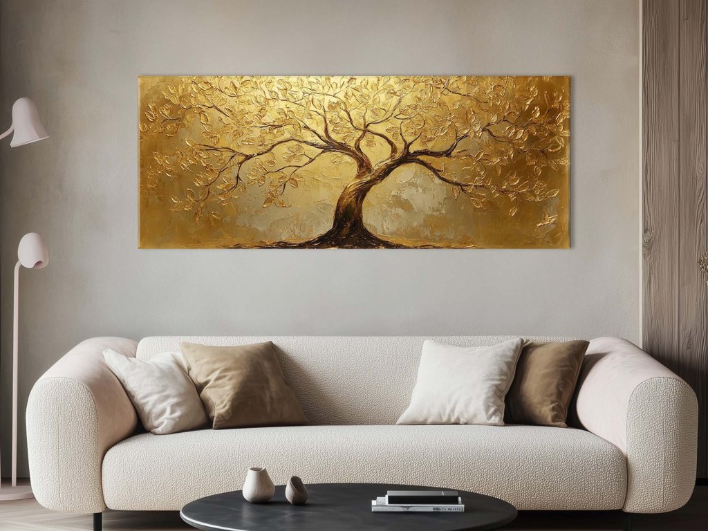 Tento obraz znázorňuje majestátny strom, ktorého vetvy a listy sú bohaté na zlaté detaily, čím symbolizuje hojnosť a životnú silu. Jemné ťahy štetca vytvárajú textúru, ktorá pridáva hĺbku a plastickosť, pričom strom akoby ožíval v zlatom svite. Celkové farebné prevedenie obrazu pôsobí luxusne a hrejivo, čím prináša do priestoru pocit rovnováhy a krásy.