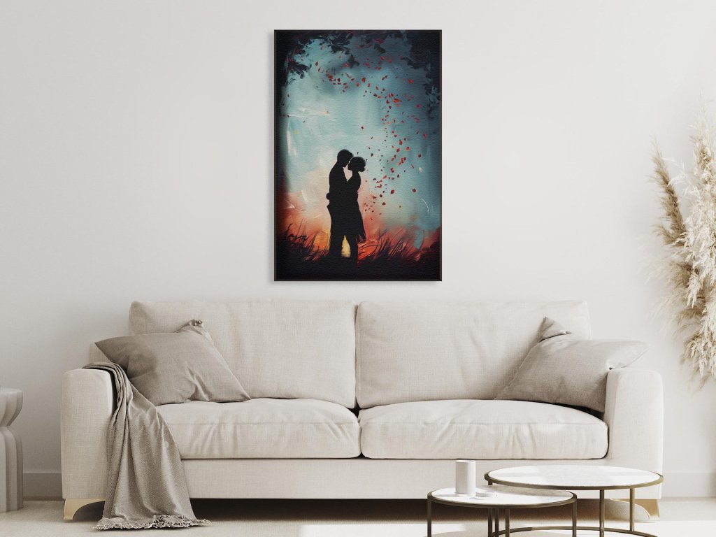 Na obraze je zobrazený pár objatý v zádumčivom tanci, siluety sú zahalené v abstraktnom pozadí s lietajúcimi červenými lístkami. Scéna pôsobí romanticky a melancholicky s dôrazom na plynutie času a krásu okamihu. Intímny moment je zachytený v protisvetle, ktoré dodáva atmosfére obrázka tajomnosť.