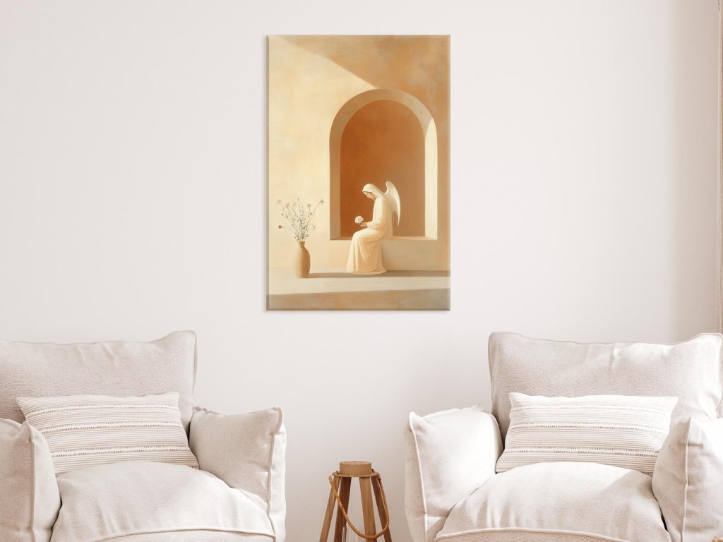 Obraz zachytáva jemnú a pokojom presiaknutú scénu, kde anjel sedí v teplom svetle pri klenbovom okne. Jeho hlava je sklonená, v rukách drží jednoduchý biely kvet, čo umocňuje dojem pokory a rozjímania. Minimalistické prostredie so svetelnou hrou vytvára kontemplatívnu a duchovne čistú atmosféru.