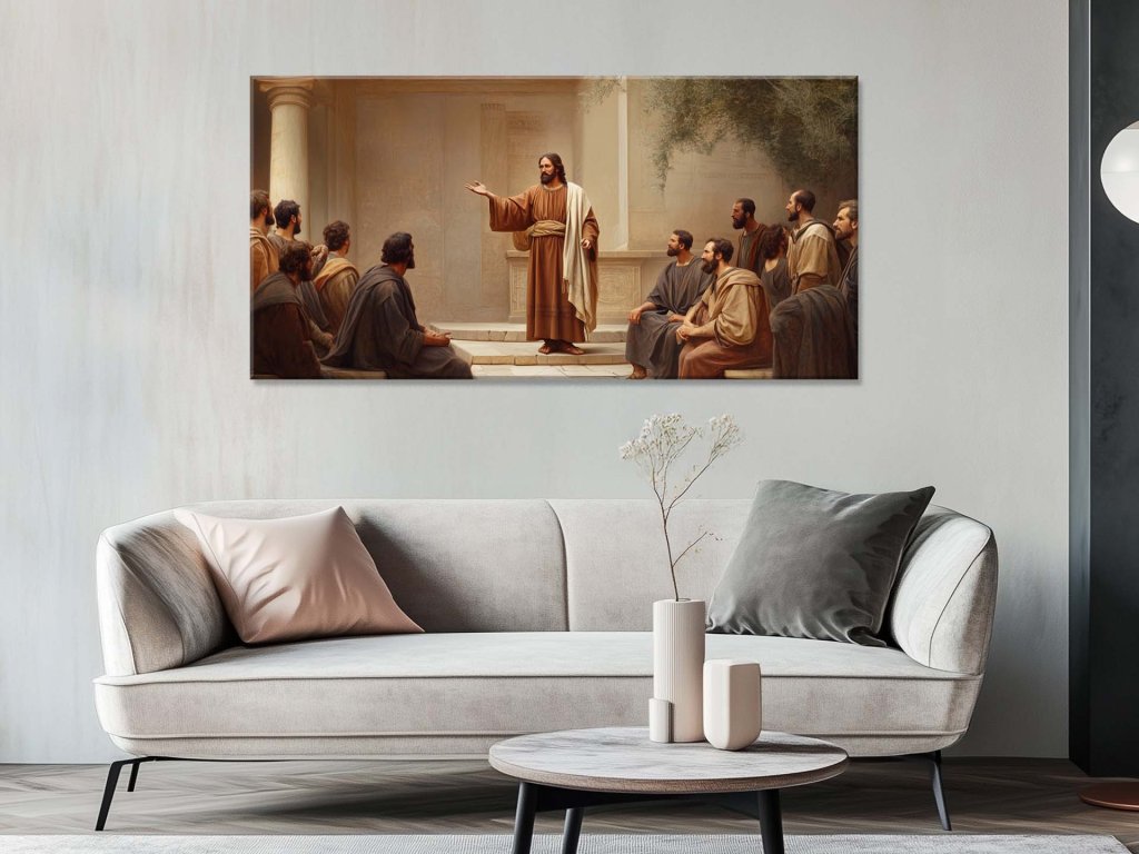 Na obraze vidíme postavu učiteľa, ktorý stojí medzi nasledovníkov ako pokojne vysvetľuje hlboké myšlienky. Okolie chrámu je ohraničené jemnými stĺpmi a vetvami olivovníkov, ktoré dotvárajú atmosféru mieru a duchovnej hĺbky. Tento moment zachytáva odovzdávanie múdrosti a porozumenia medzi generáciami v prostredí plnom úcty a pokoja.