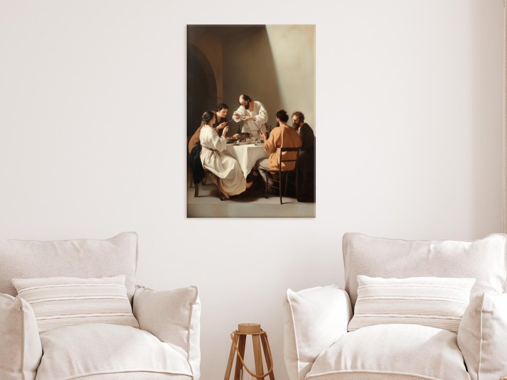 Tento intímny výjav zachytáva hostiteľa, ako núka jedlo v prítomnosti svojich blízkych ľudí. Atmosféra obrazu je pokojná a plná príjemnej atmosféry večere, zvýraznená jemným svetlom dopadajúcim zhora. Kompozícia a farebná harmónia podporujú posolstvo lásky a spoločenstva.