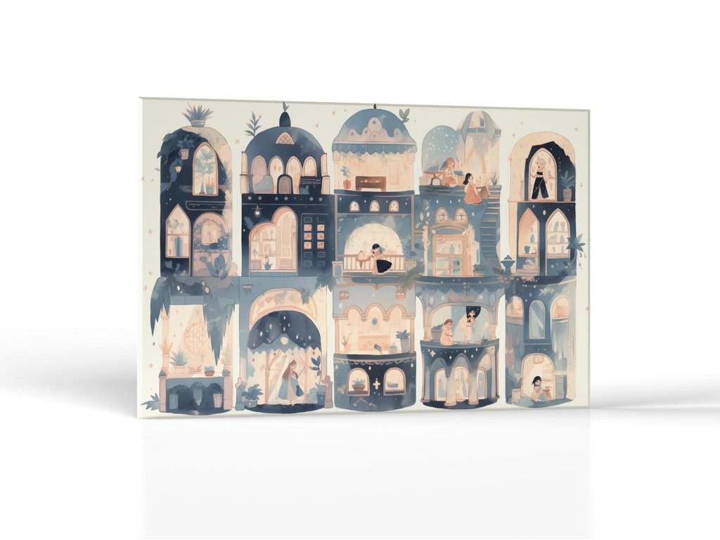 Obraz zachytáva súbor ilustrácií, ktoré tvoria komplex akvarelových domov s detailnými scénami ľudských interakcií. Jednotlivé výjavy zobrazujú ľudí na balkónoch, v interiéroch a na strechách, v situáciách ako čítanie kníh, zavlažovanie rastlín, alebo len pozorovaním hviezdnej oblohy, čo dodáva obrazu pocit komunity a tepla. Celkový dojem je posilnený jemnými farbami a mäkkým osvetlením, čím vytvára pocit pokoja a harmónie.