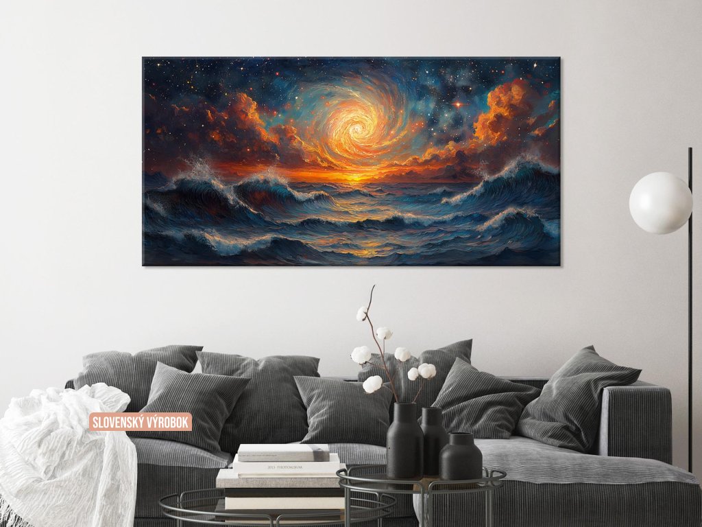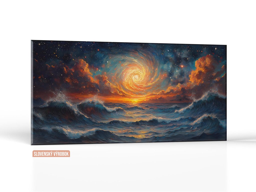 Tento obraz spája silu mora s majestátnosťou vesmíru, kde víriaca žiara na oblohe pripomína vznik galaxie alebo zázračné nebeské zjavenie. Vlny sa valia smerom k divákovi, akoby reagovali na kozmickú energiu nad nimi. Farebný kontrast medzi tmavomodrým oceánom a žiarivo oranžovým nebom vytvára výnimočnú dynamiku a emotívnu hĺbku.
