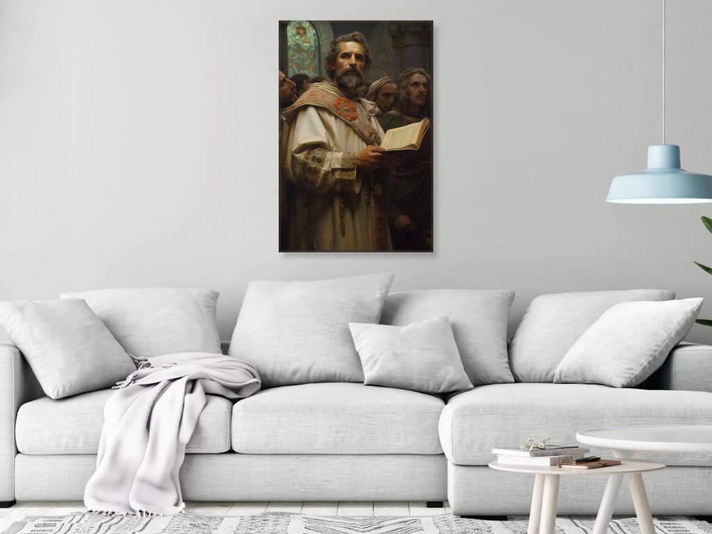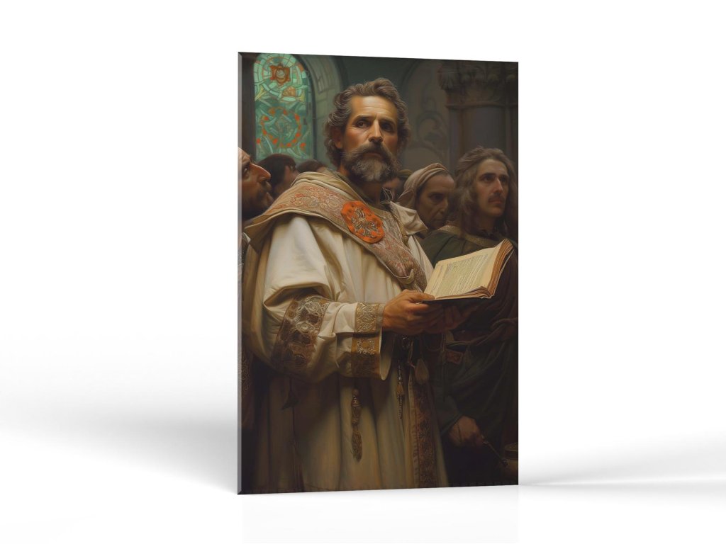 Obrázok ukazuje staršieho muža s hĺbavým pohľadom, odetého v bohato zdobenom renesančnom rúchu s knihou v ruke. Stojí pred pozadím s vitrážovým oknom, a jeho postoj vyžaruje autoritu a rozvahu. Výraz na jeho tvári a postoj naznačujú, že je to osoba s vysokým postavením, možno učenec alebo duchovný vodca.