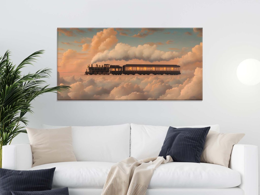 Obraz zachytáva nostalgickú scénu starého parného vlaku, ktorý ako z rozprávky prechádza oblohou medzi oblakmi. Teplé svetlá vo vagónoch vytvárajú pocit útulnosti a bezpečia, zatiaľ čo ružovo-modrá obloha dotvára snovú atmosféru. Tento výjav spája minulosť s fantáziou a otvára dvere do sveta, kde je možné všetko.