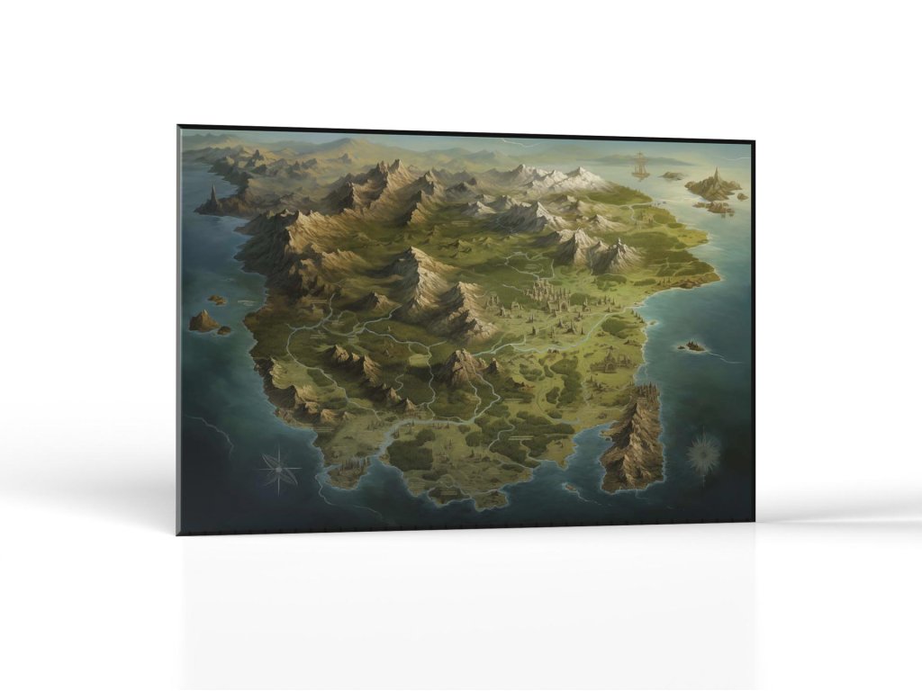 Na mape sú vyobrazené husté zelené lesy, vetrané horské chrbty a členité pobrežie s ostrými skalnatými útvarmi. Priezračné rieky prechádzajú cez rôznorodé biotopy a ústia do modrého mora, kde plávajú majestátne lode. Zdá sa, že tento svet je plný dobrodružstiev s potenciálom pre epické príbehy a legendy.