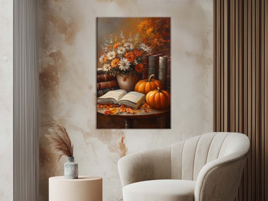Tento obraz zachytáva romantickú jesennú scénu, kde sa na drevenom stole nachádza otvorená kniha, vedľa ktorej je roztrúsené pestrofarebné lístie a malé tekvice. Okolie zdobia staré zväzky kníh a bohato zdobená kytica bielych a oranžových kvetov, ktoré vyvolávajú dojem nostalgie a príjemného jesenného podvečera. Celková atmosféra vyžaruje pokoj, harmóniu a pozýva diváka na chvíľu relaxu pri dobrej knihe v magickom jesennom prostredí.