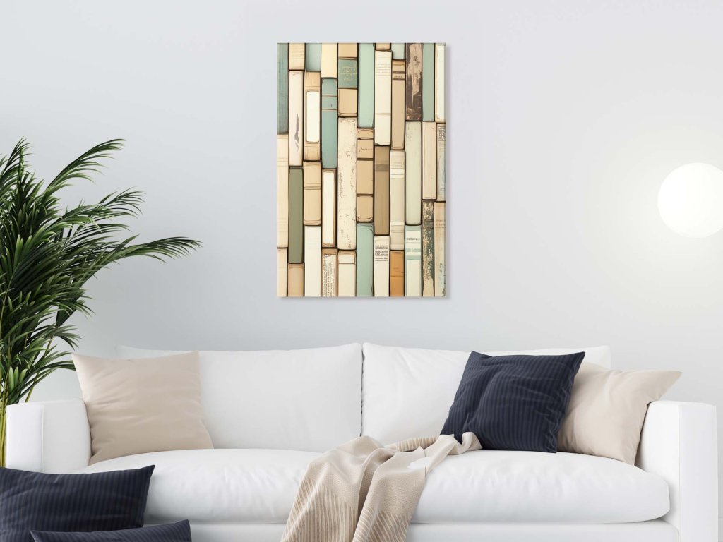 Tento obraz zachytáva pohľad na staré knihy tesne usporiadané vedľa seba, pričom ich opotrebované obaly a tlmené farby vytvárajú dojem nostalgie a pokory pred múdrosťou minulých generácií. Jemné odtiene modrej, béžovej a hnedej harmonicky splývajú a dodávajú kompozíciu vizuálnej miestnosti a elegancie. Celková atmosféra diela pripomína knižnice starých domovov či akademických archívov, kde sú príbehy a vedomosti uchovávané pre budúcu generáciu.
