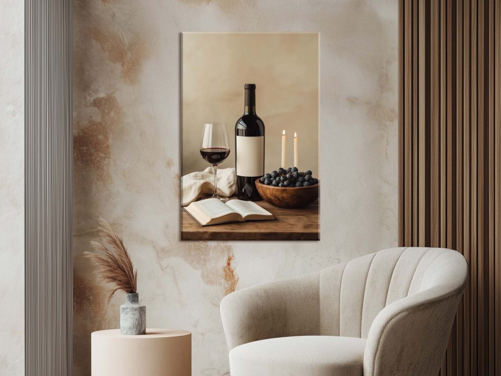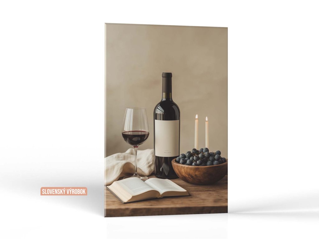Tento obraz zachytáva elegantné zátišie, kde sa na drevenom stole nachádza fľaša červeného vína spolu s pohárom, miskou plnou čerstvého hrozna a otvorenou knihou. Dve horiace sviečky vytvárajú atmosféru pokoja a relaxácie, pričom ich jemné svetlo vrhá teplé odtiene na okolitý priestor. Celková kompozícia vyžaruje pocit harmónie, pohody a chvíľky zaslúženého oddychu.