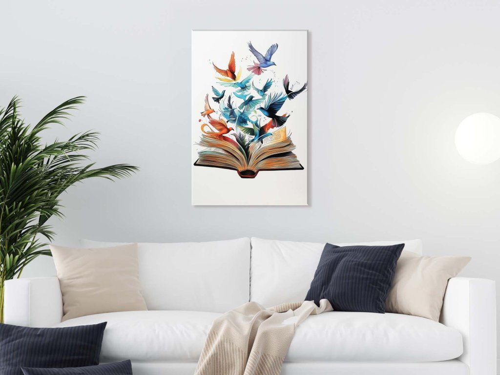 Tento obraz zachytáva dynamický výjav, kde sa z otvorenej knihy vznášajú farebné vtáky, akoby slová a myšlienky získali krídla a ožili. Kombinácia teplých a chladných odtieňov vytvára vizuálne bohatú kompozíciu, ktorá evokuje pocit slobody, fantázie a nekonečných možností poznania. Celková atmosféra diela zdôrazňuje silu literatúry a jej schopnosť preniesť človeka do iného sveta, otvárajúc brány predstavivosti.