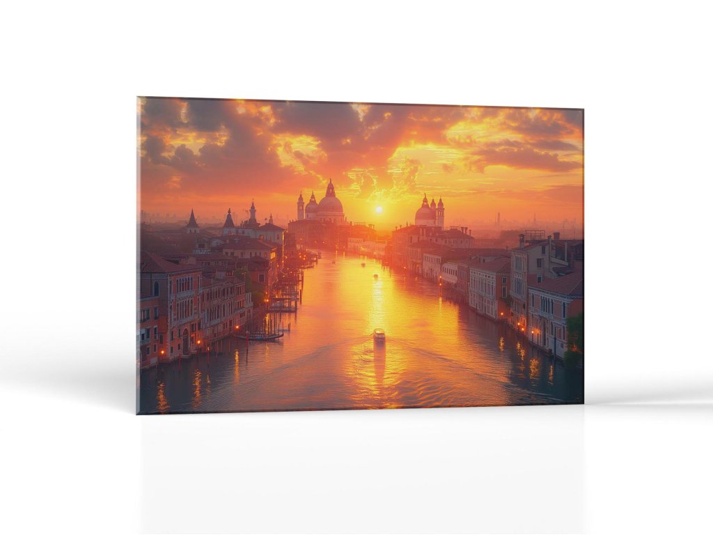Slnko vychádza nad horizontom, kúpe historické benátske budovy v teplom svetle. Odraz slnka na vode kanála pridáva k scenérii magický nádych, zatiaľ čo mesto sa pomaly prebúdza do nového dňa. Vzdialené siluety gondol a budov sa rysujú proti jemnému ránu.