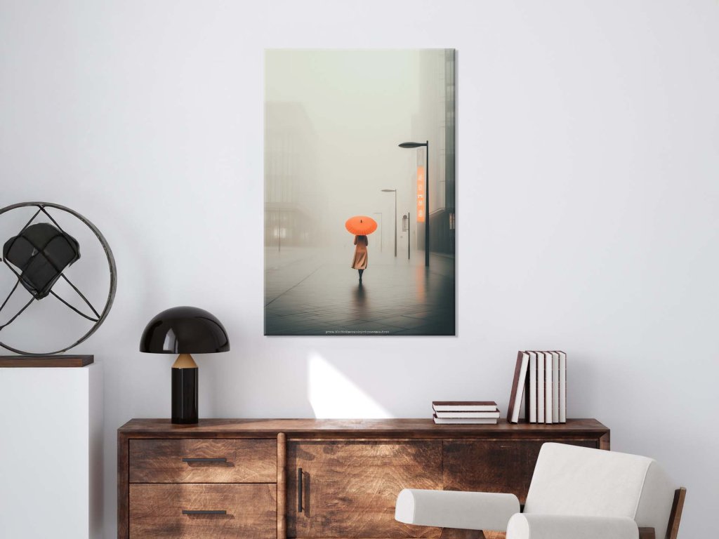 Obraz zachytáva tichú, melancholickú scénu, v ktorej sa osamelá postava s oranžovým dáždnikom pomaly stráca v hustej mestskej hmle. Moderná architektúra v pozadí len letmo presvitá cez sivý závoj, zatiaľ čo teplé svetlo z neónového nápisu dodáva miestu nádych života. Kontrast medzi jemnosťou hmly a výraznou oranžovou farbou vytvára vizuálne pôsobivý moment plný emócií a ticha.